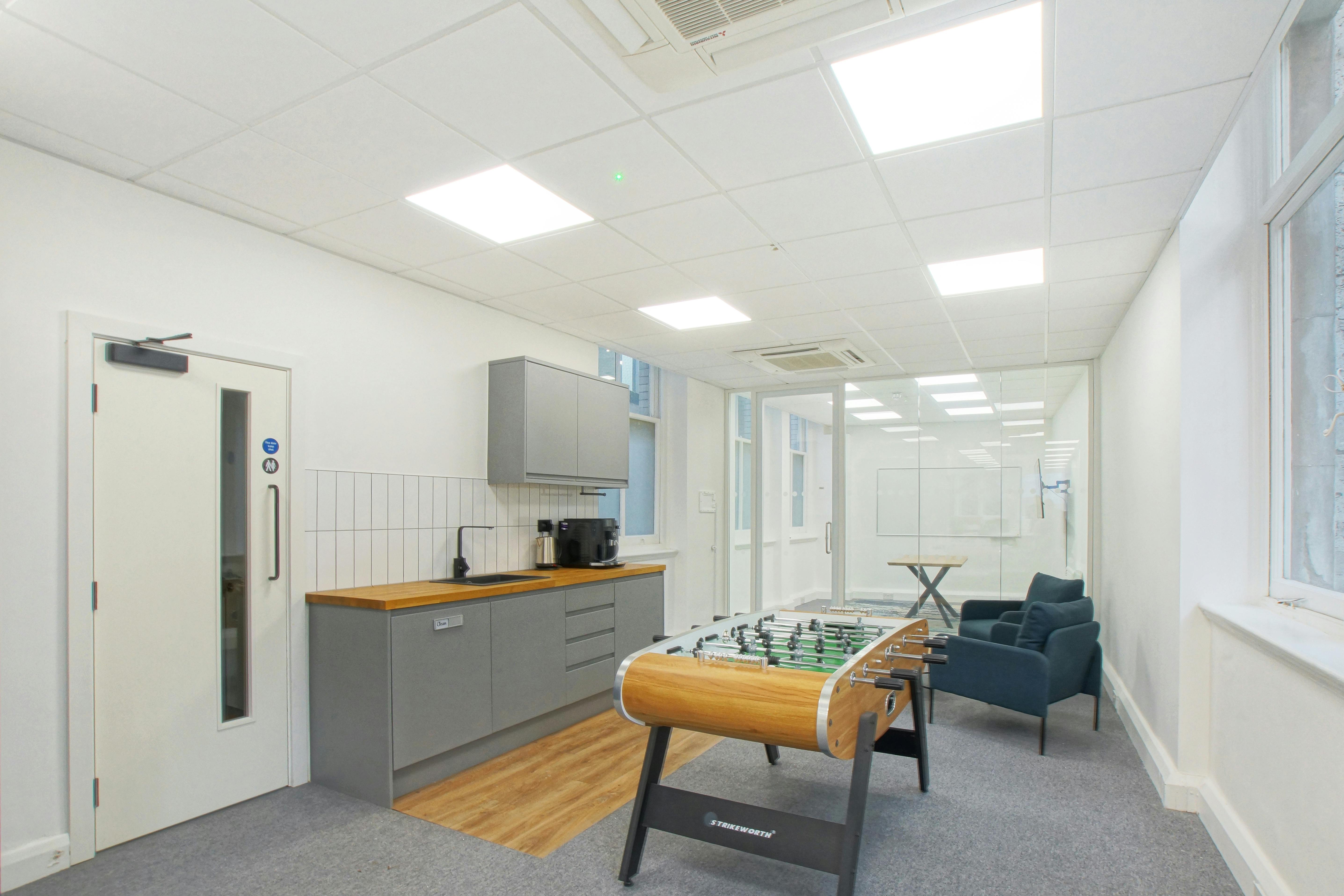 The 1st floor provides fully fitted and furnished accommodation comprising 10x open plan desks, 1x 6-person meeting room, 3x phone booths, kitchenette and breakout area in situ.