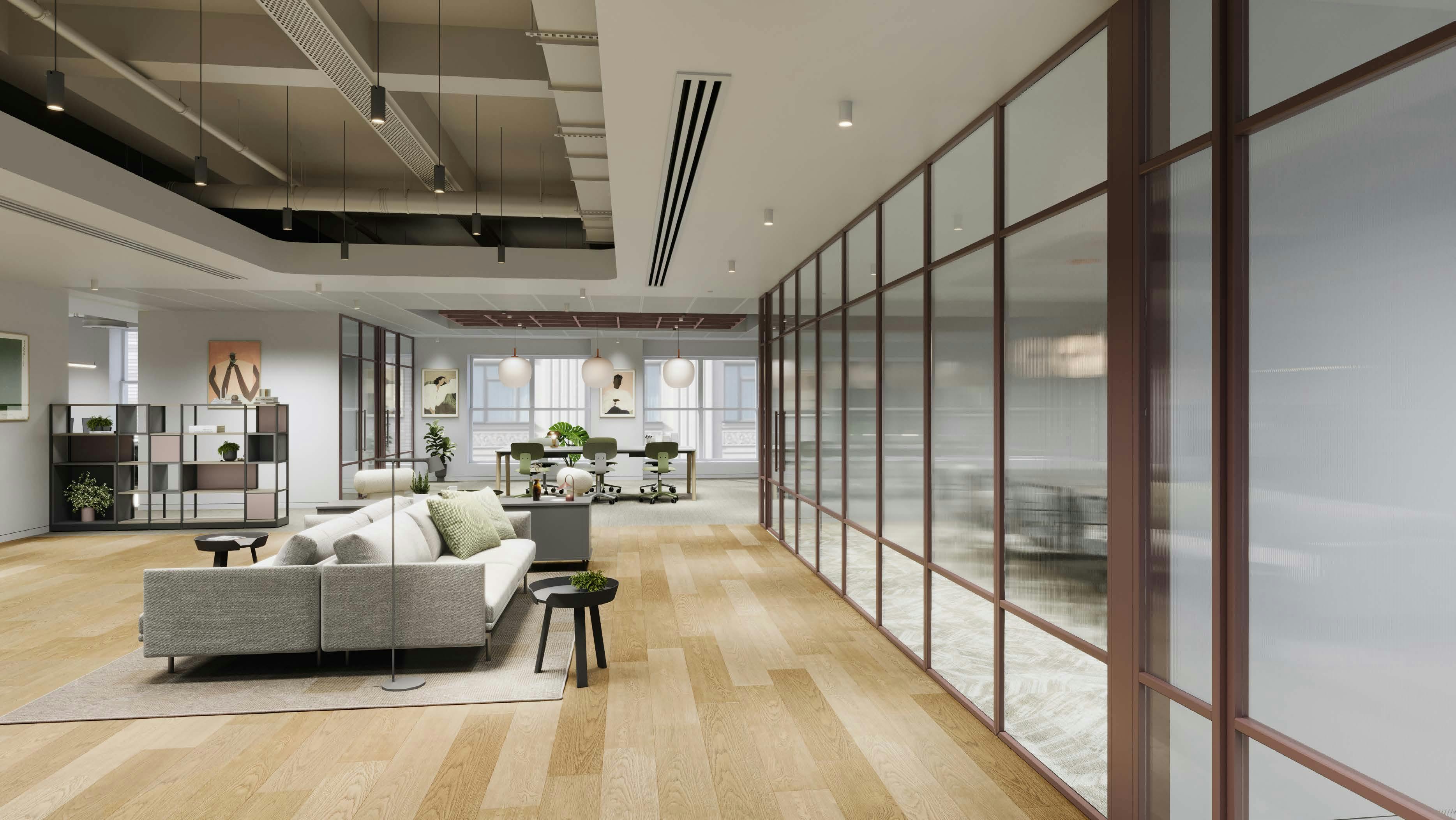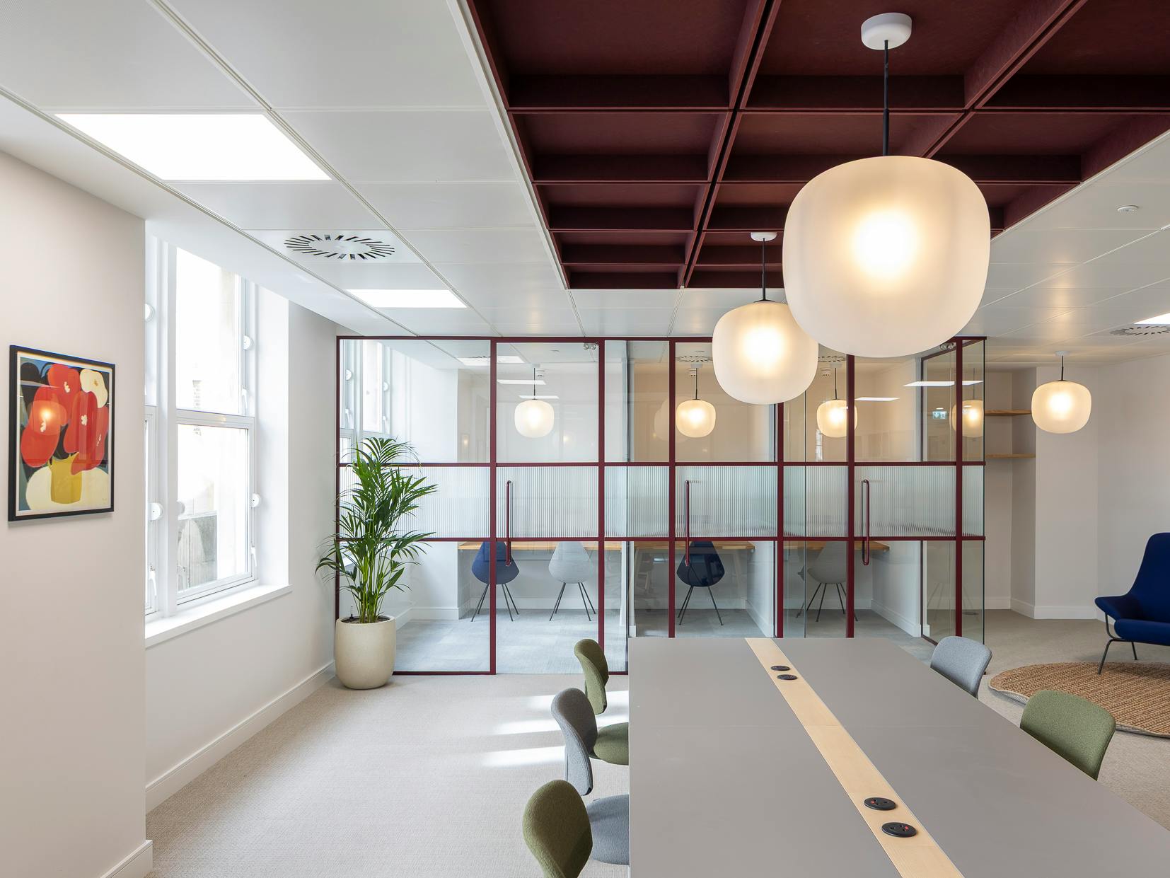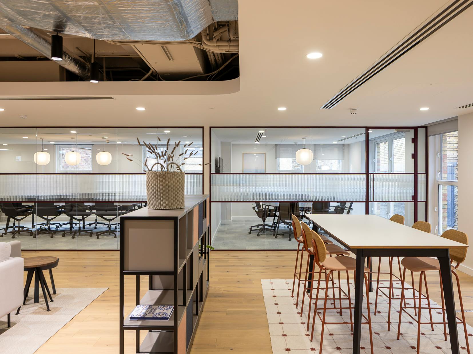 - 10-12 person boardroom, 8 person meeting room, 2 x 2 person meeting rooms, 3 x call rooms, 52 workstations, kitchen, collaboration/breakout spaces and welcome area